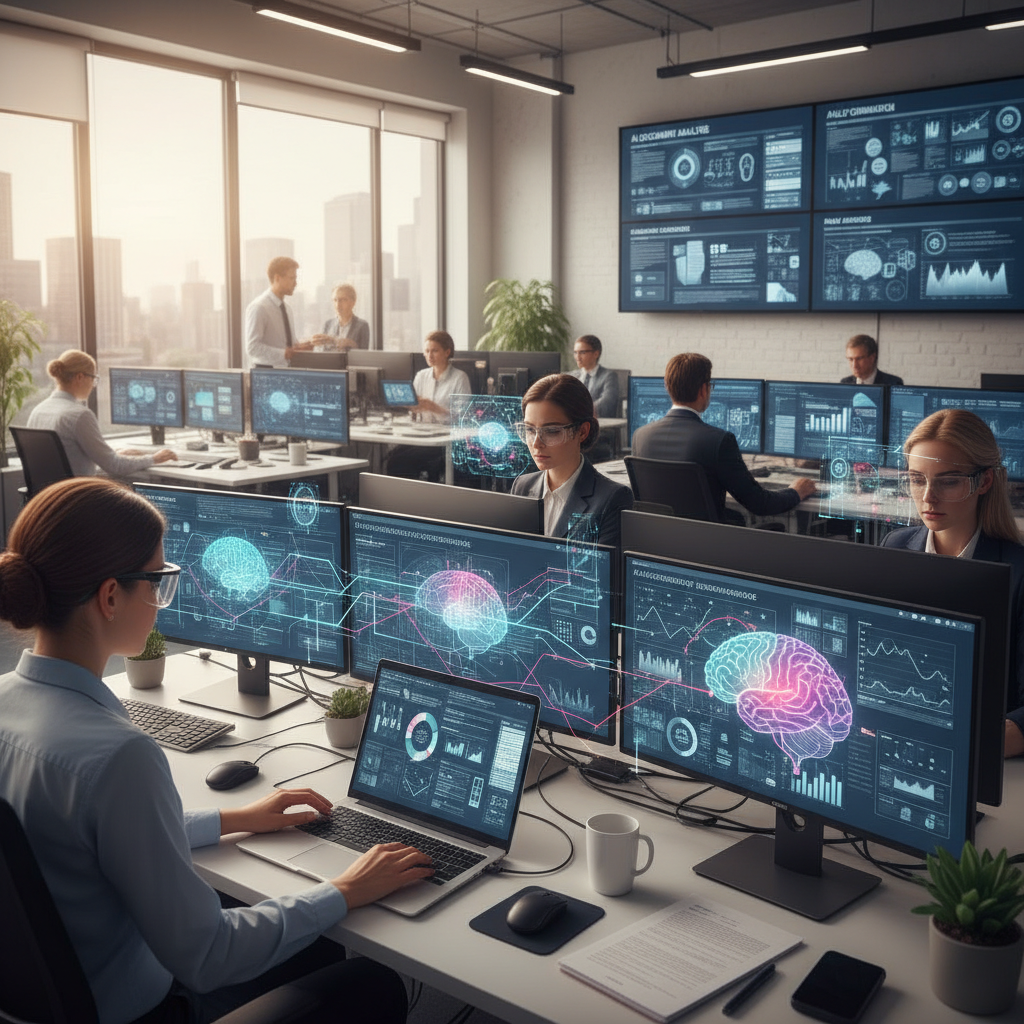 Zdjęcie: Wizja polskiego urzędu w 2030 roku – AI i ludzie współpracują w nowoczesnym środowisku biurowym.