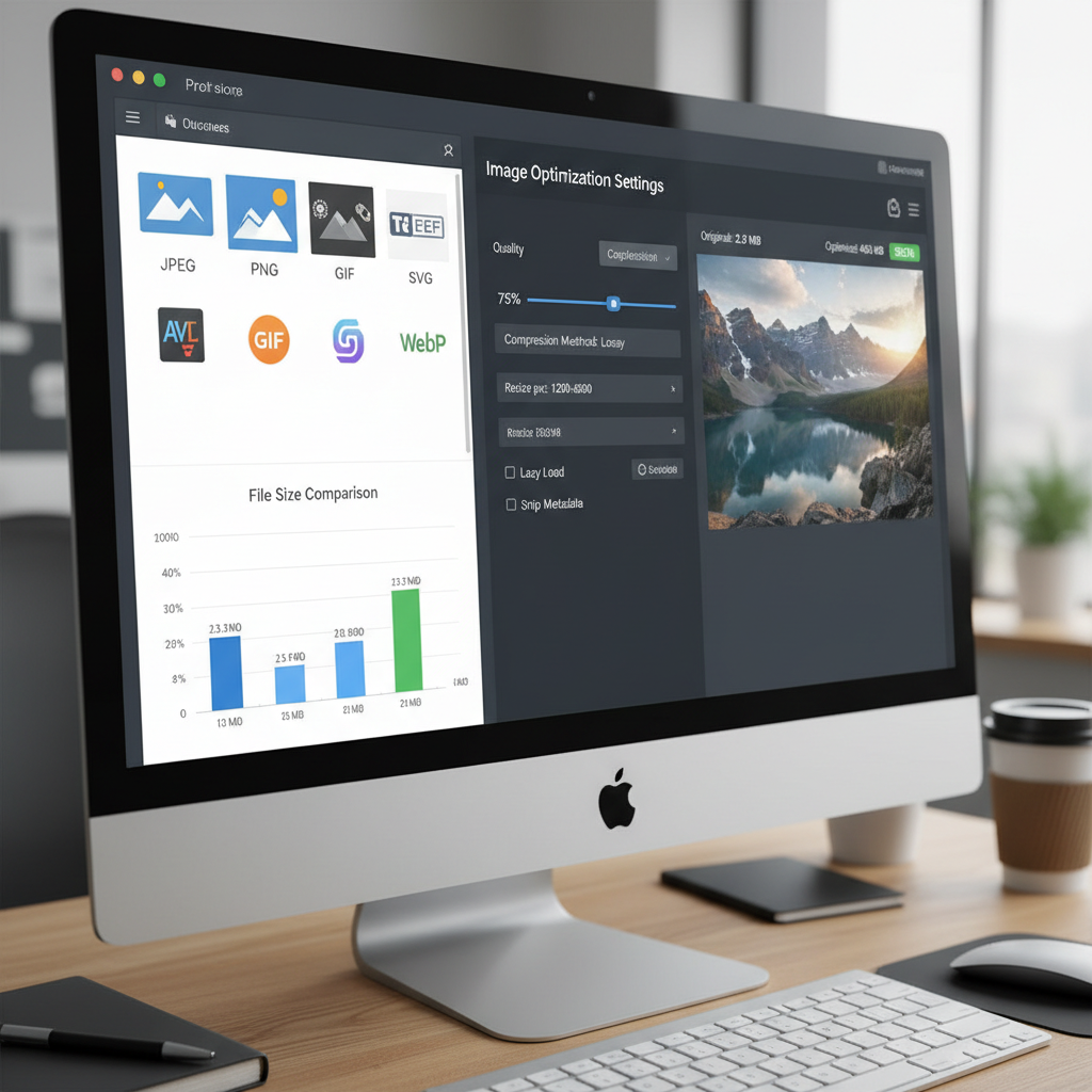- Zastosuj kompresję (70-85% JPEG, WebP, AVIF) i usuwanie metadanych.