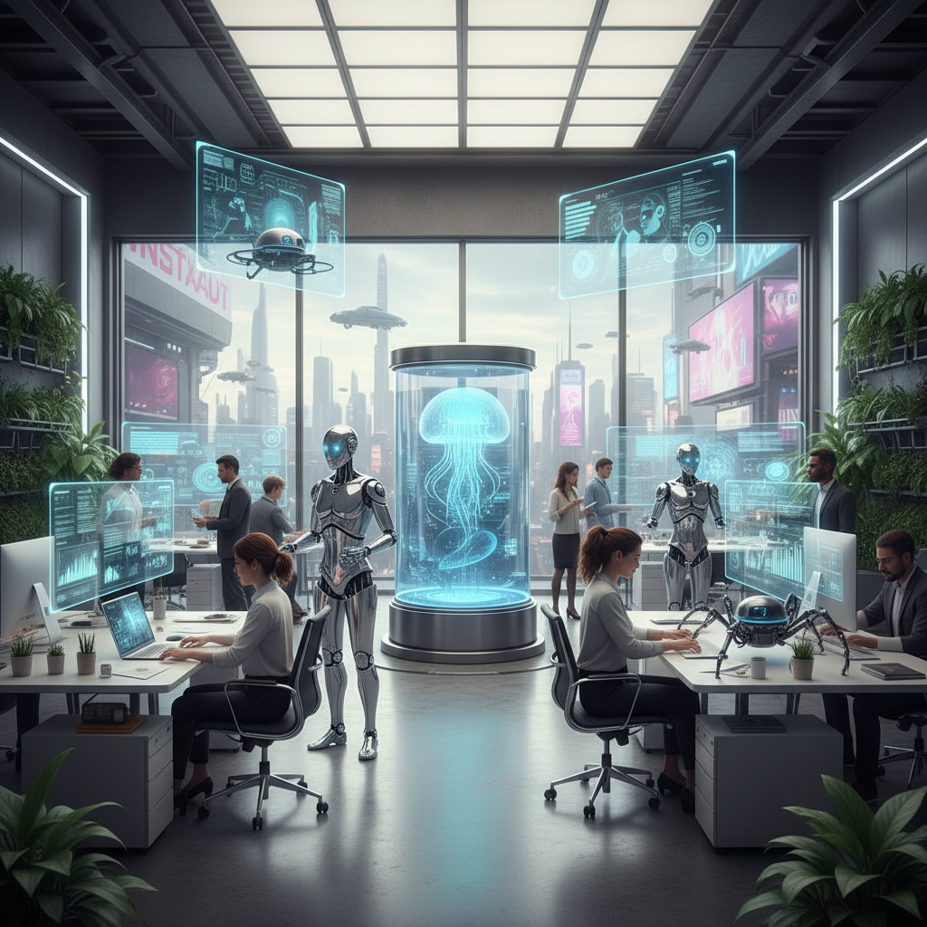 Naturalna scena biurowa z AI. Alt: Współpraca ludzi i AI w codziennej pracy biurowej.