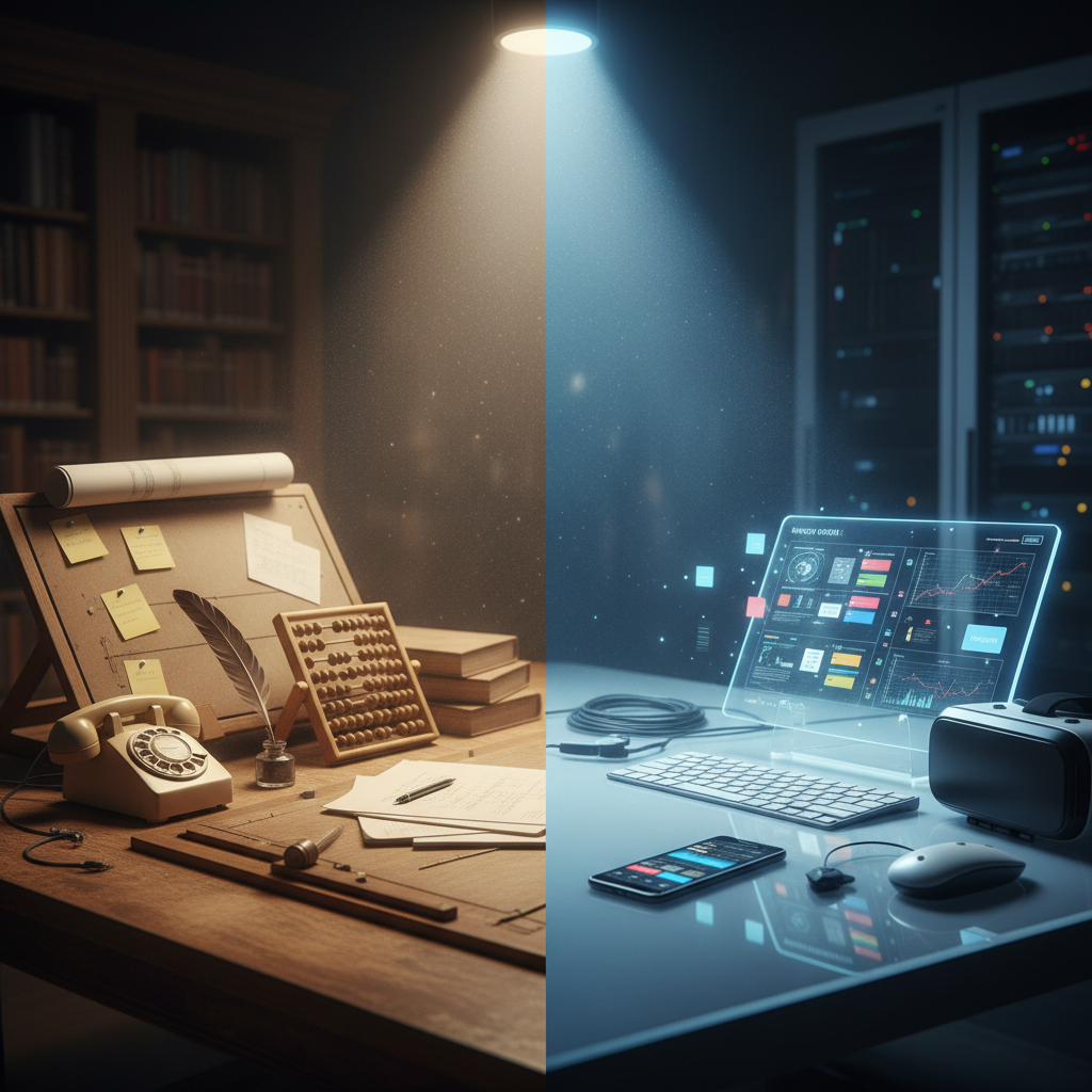 Porównanie narzędzi – od papieru po AI. Alt: Porównanie tradycyjnych i nowoczesnych narzędzi do zarządzania projektami.